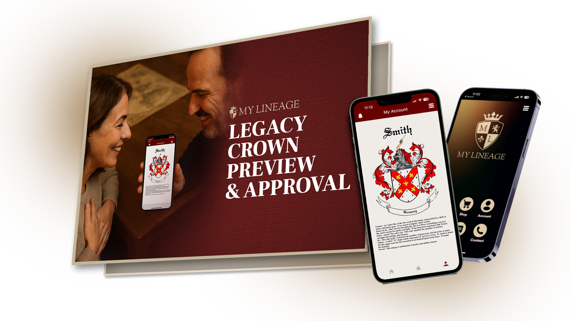 The Legacy Crown Preview is your family’s private unveiling the moment your story first takes form. Before a single stitch of gold bullion thread is placed or a blade is folded by fire, you’ll receive a full-color rendering of your verified coat of arms, presented with a symbolism guide that reveals the meaning of every element from lions of courage, red for honor and azure of loyalty.