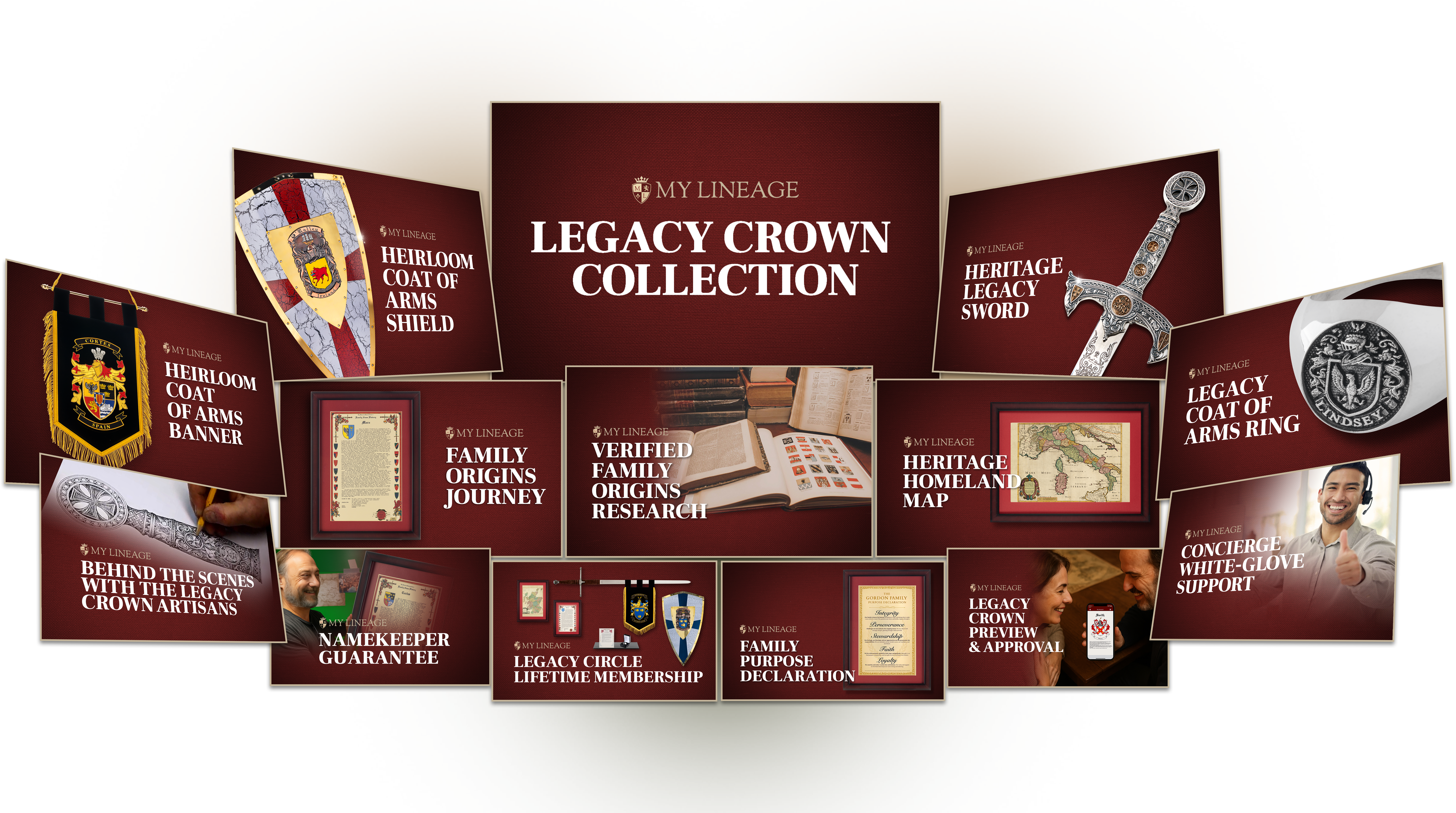 Each Legacy Crown Collection is crafted as a one-of-one commission. While the heritage research connects to the same verified lineage, every banner, blade, shield, and ring is personalized to the household that commissions it, ensuring each branch is honored in its own right.